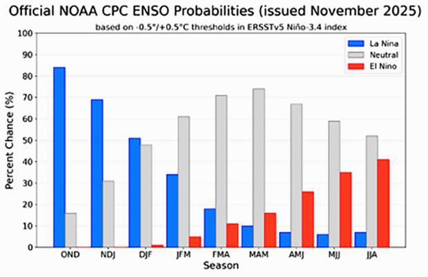 Claramente, se consideraba en noviembre del año pasado, que la Niña instalada en el último trimestre, menguaba sus efectos hacia marzo-abril-mayo 2026 (figura 1), a la vez que se iba incrementando la fase Neutral con un máximo, justamente en ese trimestre, casi, coincidiendo también, en el aumento de las probabilidades del ENSO (El Niño-Oscilación del Sur) (Official NOAA CPC ENSO Probabilities, 2025).